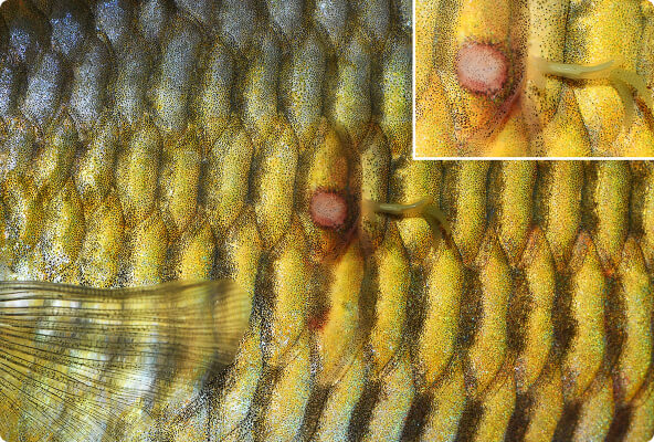 Anchor worms, contrary to their name, are worms at all. They are large, parasitic crustaceans that often affect pond fish. They attach themselves to fish’s skin and bury their heads in a fish’s muscles. You may be able to see the parasite on your fish if you look closely enough. The look like whitish, freen threads. Common symptoms of Anchor Worms are red and inflamed scales and your fish will likely be rubbing itself against its tank. If a larger fish becomes infected with Anchor worms, the parasite can typically be removed by pulling the body of the parasite out of the fish and applying a topical antibiotic ointment to the fish’s scales. It is also a good idea to clean the entire tank to ensure there are no larvae or eggs of the parasite left.